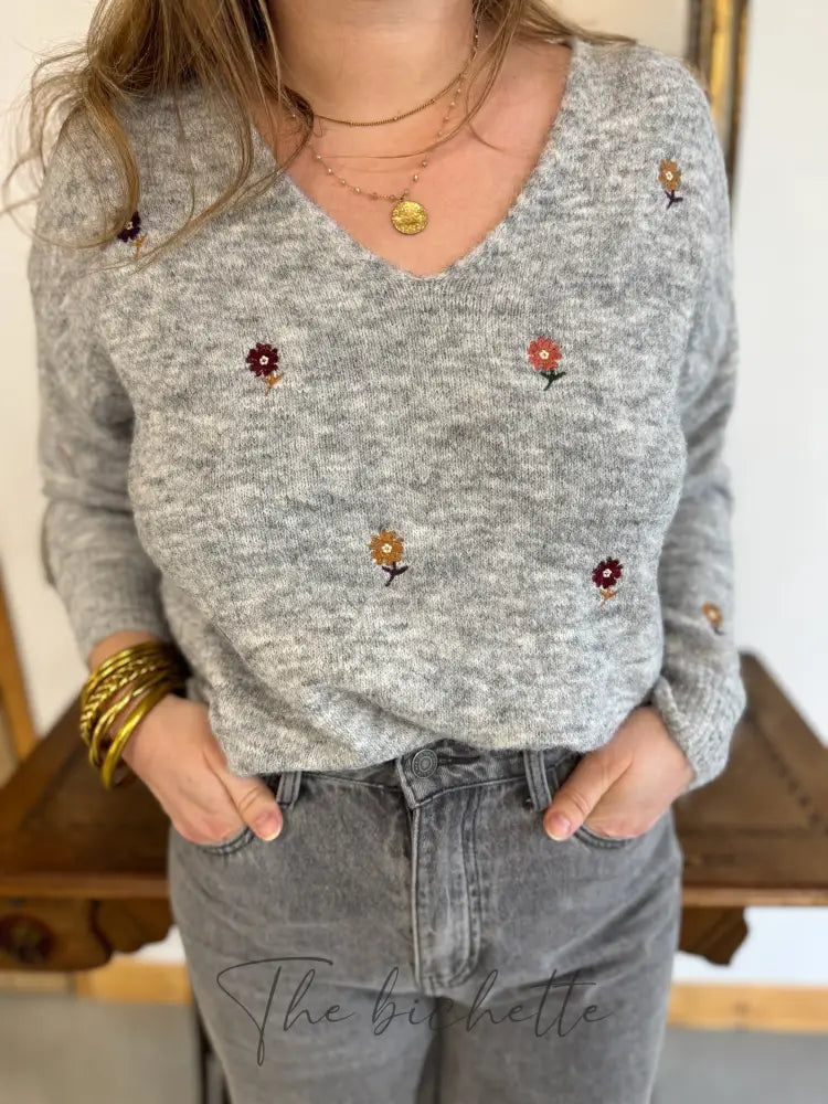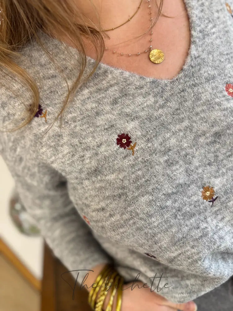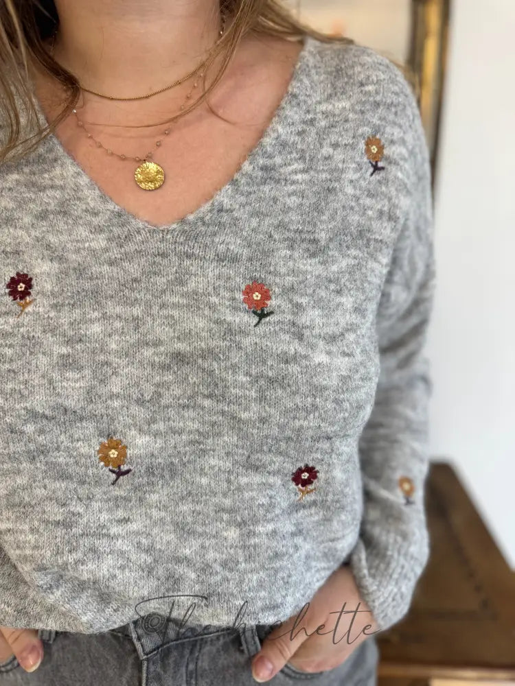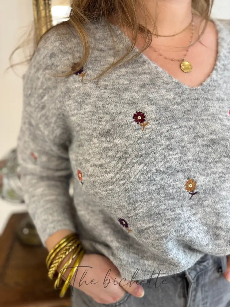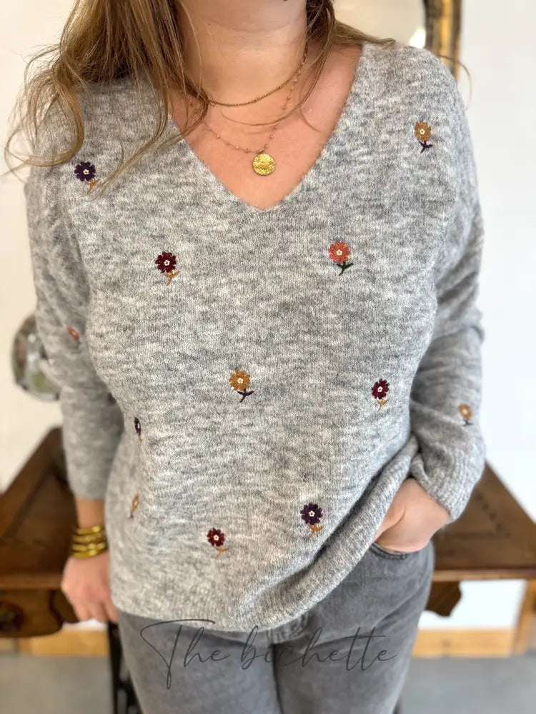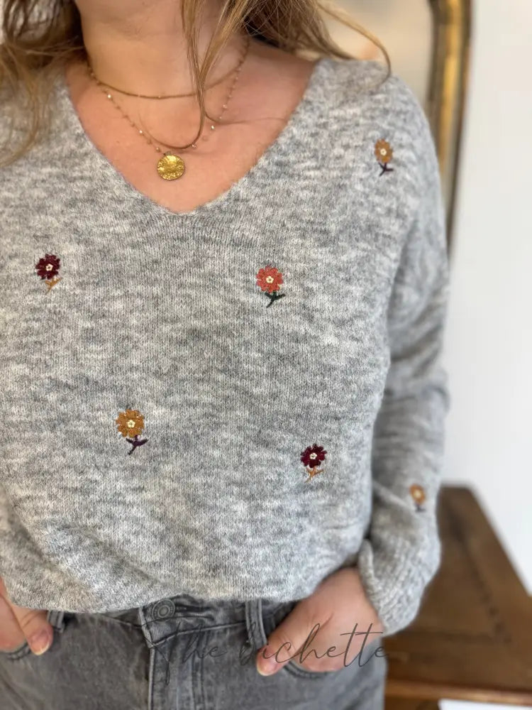 Pull gris à motifs fleuris brodés • Lili & Lala