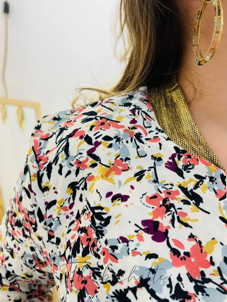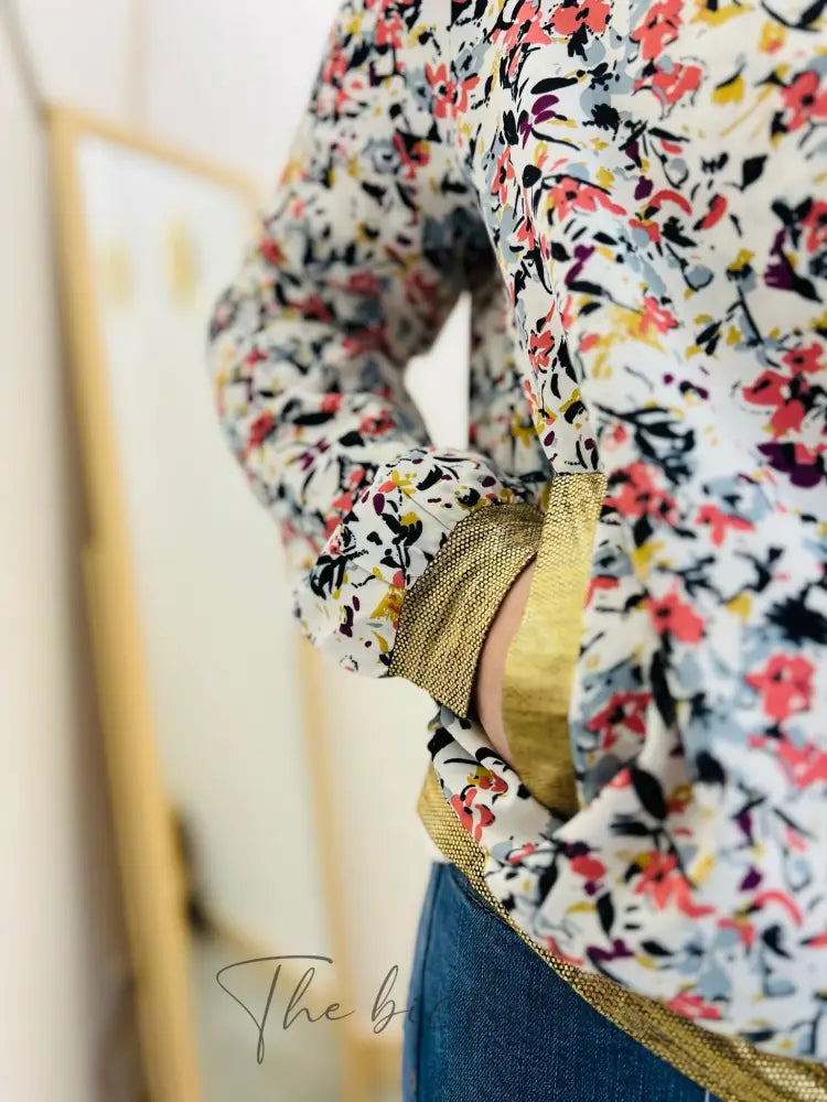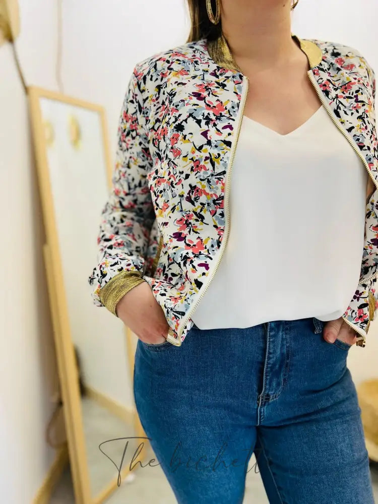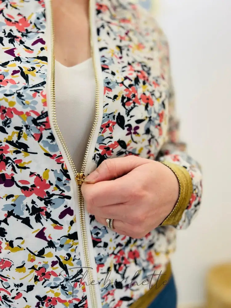 Bomberjacke mit Blumenmuster in Weiß, Schwarz, Gelb und Lila