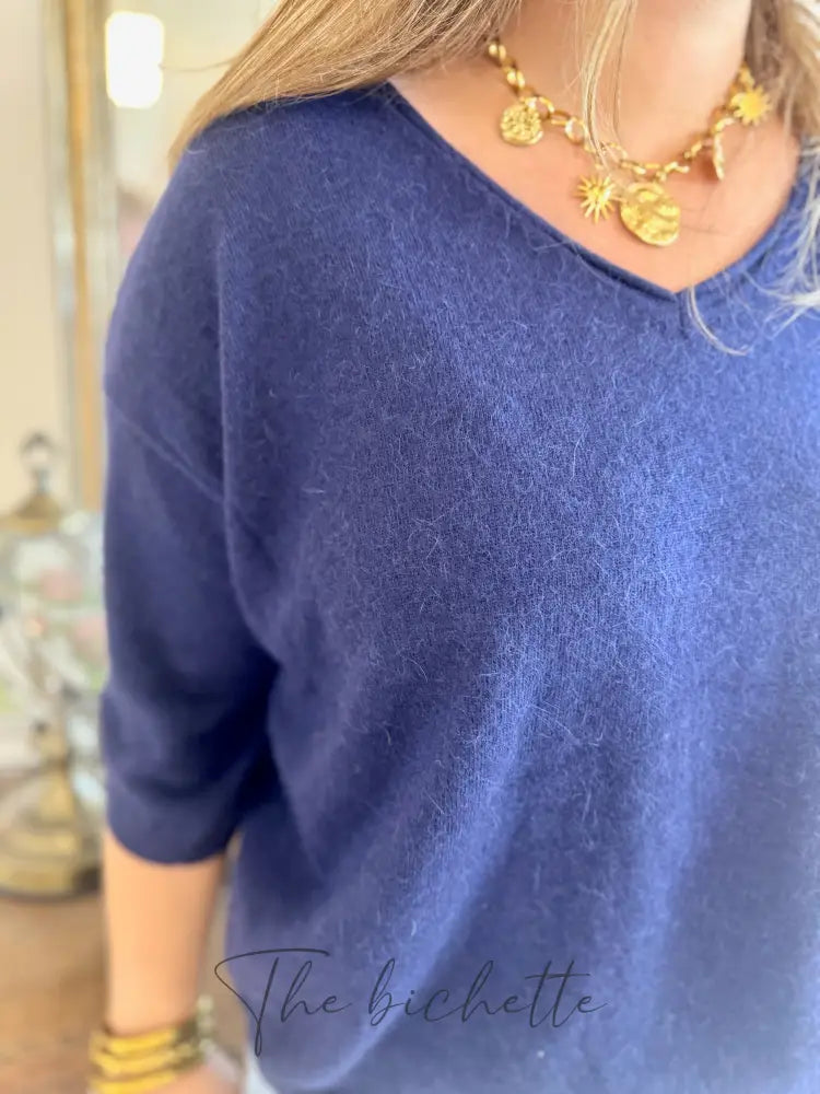 Dieser weiche Strickpullover mit V-Ausschnitt bietet Ihnen absoluten Komfort. Mit seinen 3/4-Ärmeln und der Vordertasche vereint es Stil und Funktionalität. Dieser Limettenpullover ist ideal für kühle Tage und verleiht Ihrem Outfit einen Hauch von Eleganz.