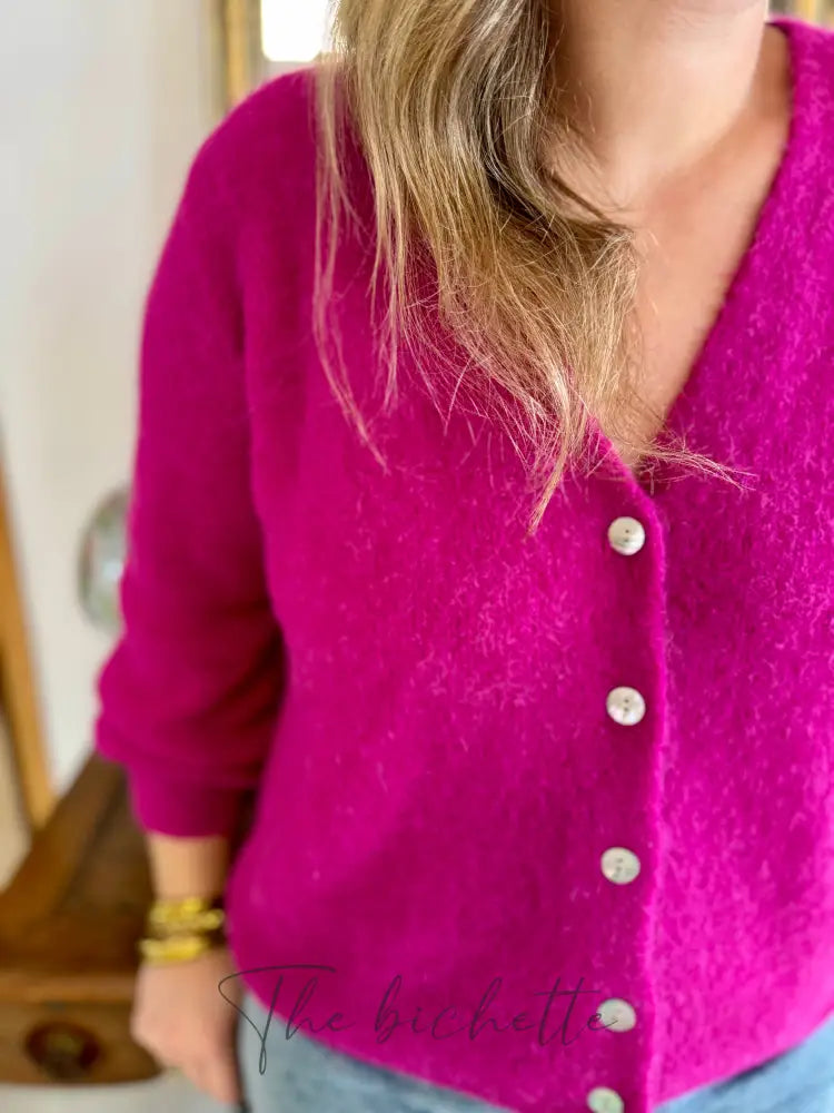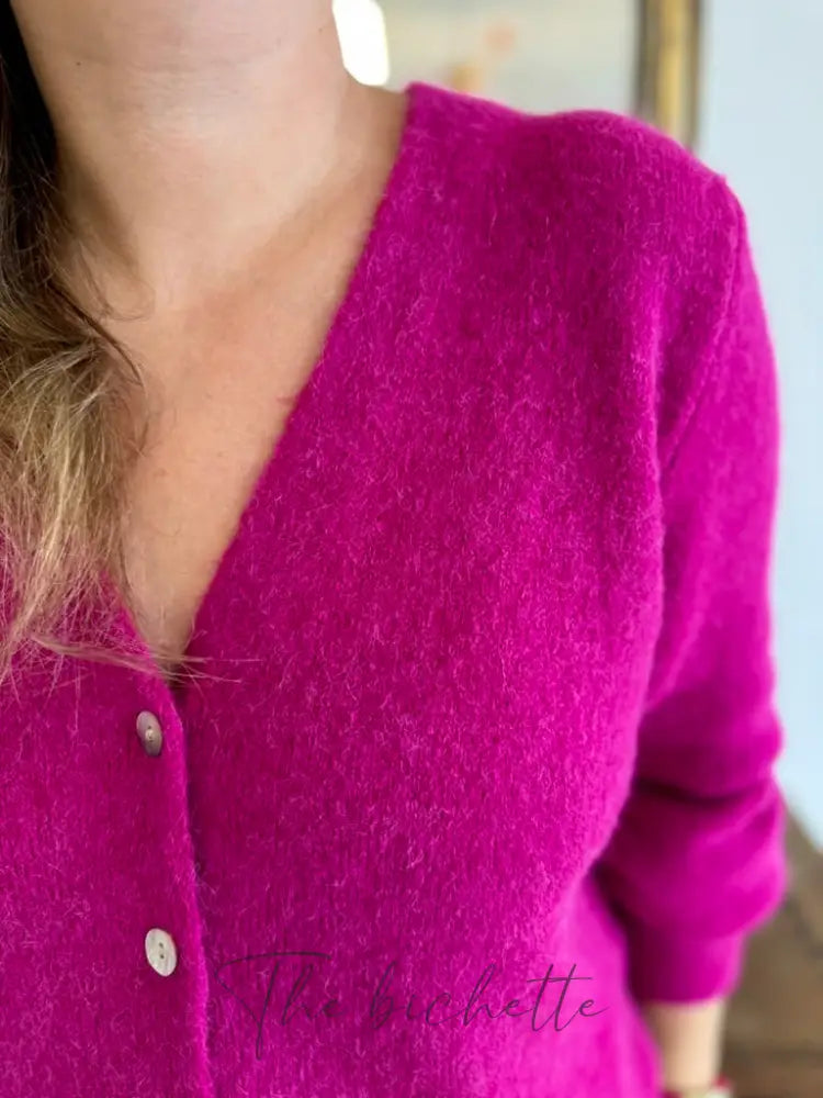 Entdecken Sie den Jeanne-Cardigan mit V-Ausschnitt und sehr dichtem Strick für ein sehr weiches Tragegefühl. Perlenfarbene Knöpfe sorgen für einen Hauch von Stil, während die langen Ärmel mit Bündchen und der gerade Schnitt für ultimativen Komfort sorgen. Genießen Sie seine endlose Süße!