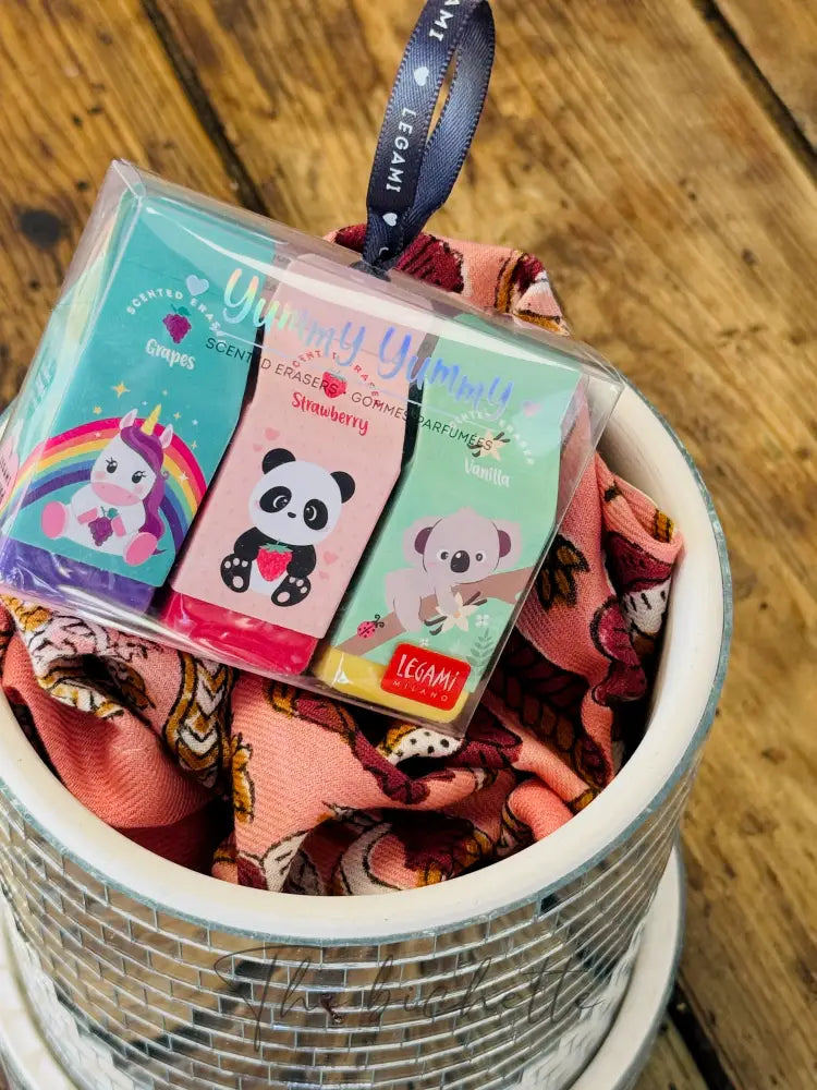 Das Legami Yummy Yummy Duft-Radiergummi-3er-Set enthält drei unwiderstehliche Freunde: Einhorn, Panda und Koala. Jeder ist bunt, duftet und bereit, Ihre Fehler auszuradieren und Ihrem Schreibtisch oder Federmäppchen einen Hauch von Verspieltheit zu verleihen.