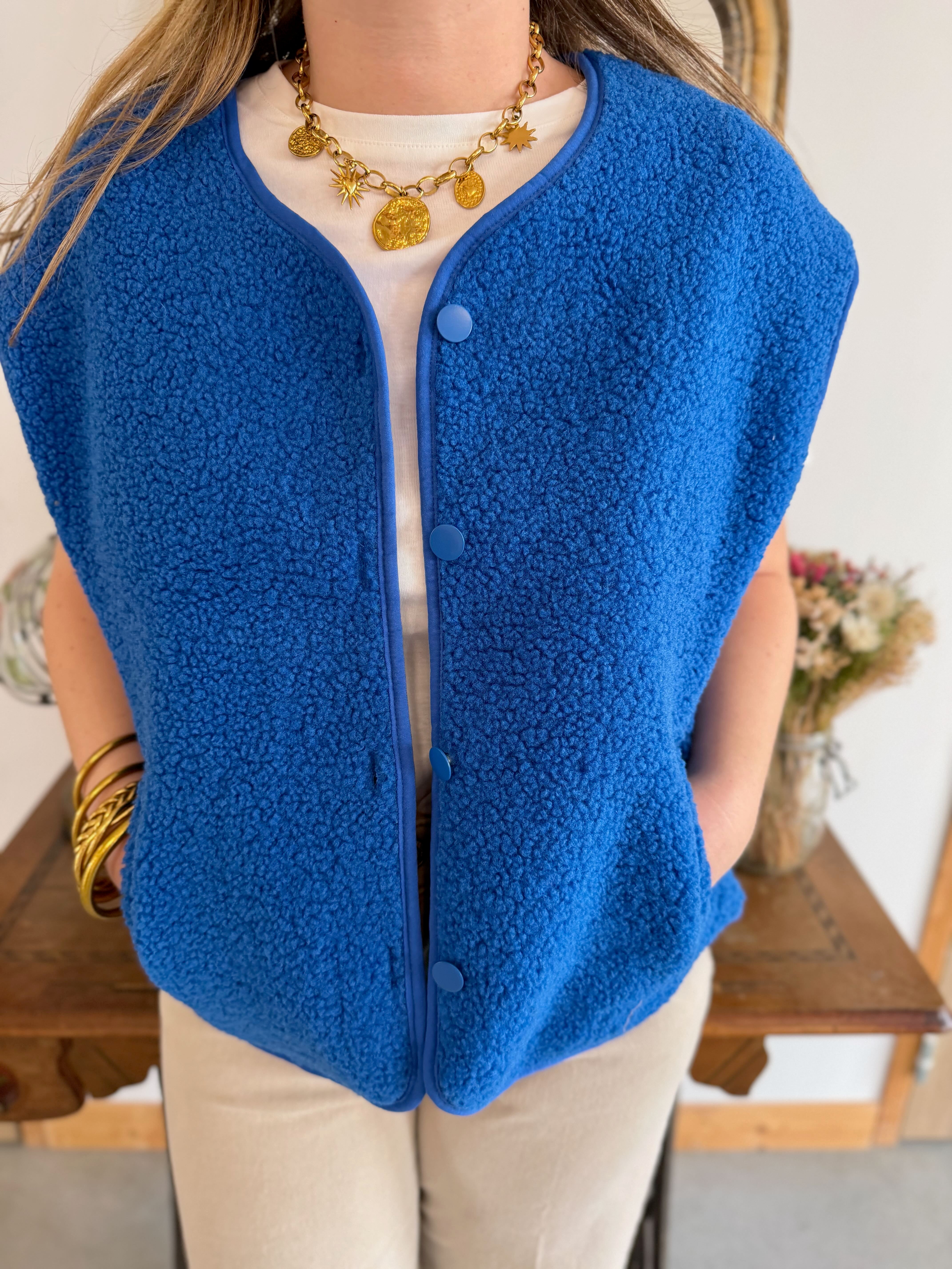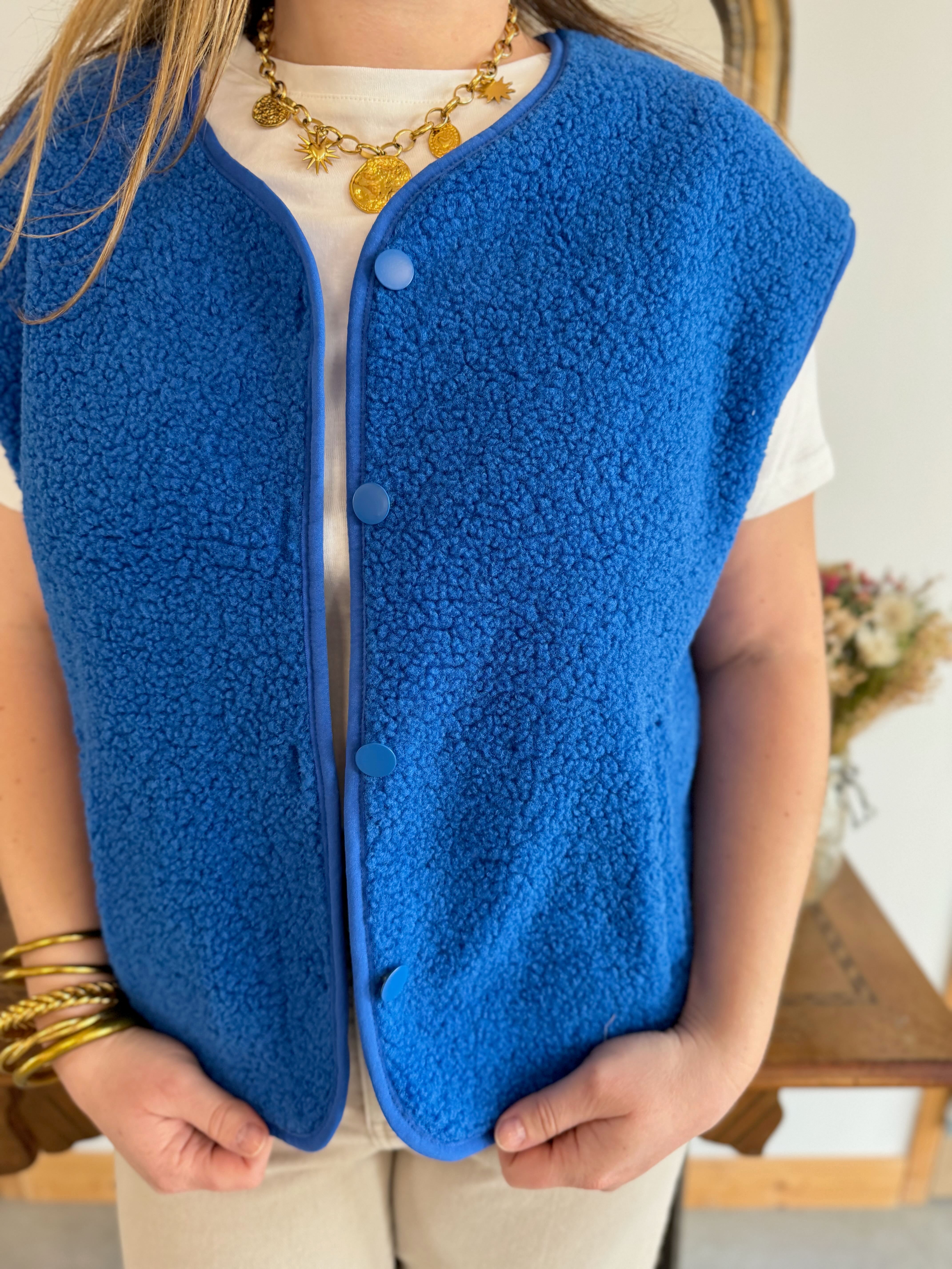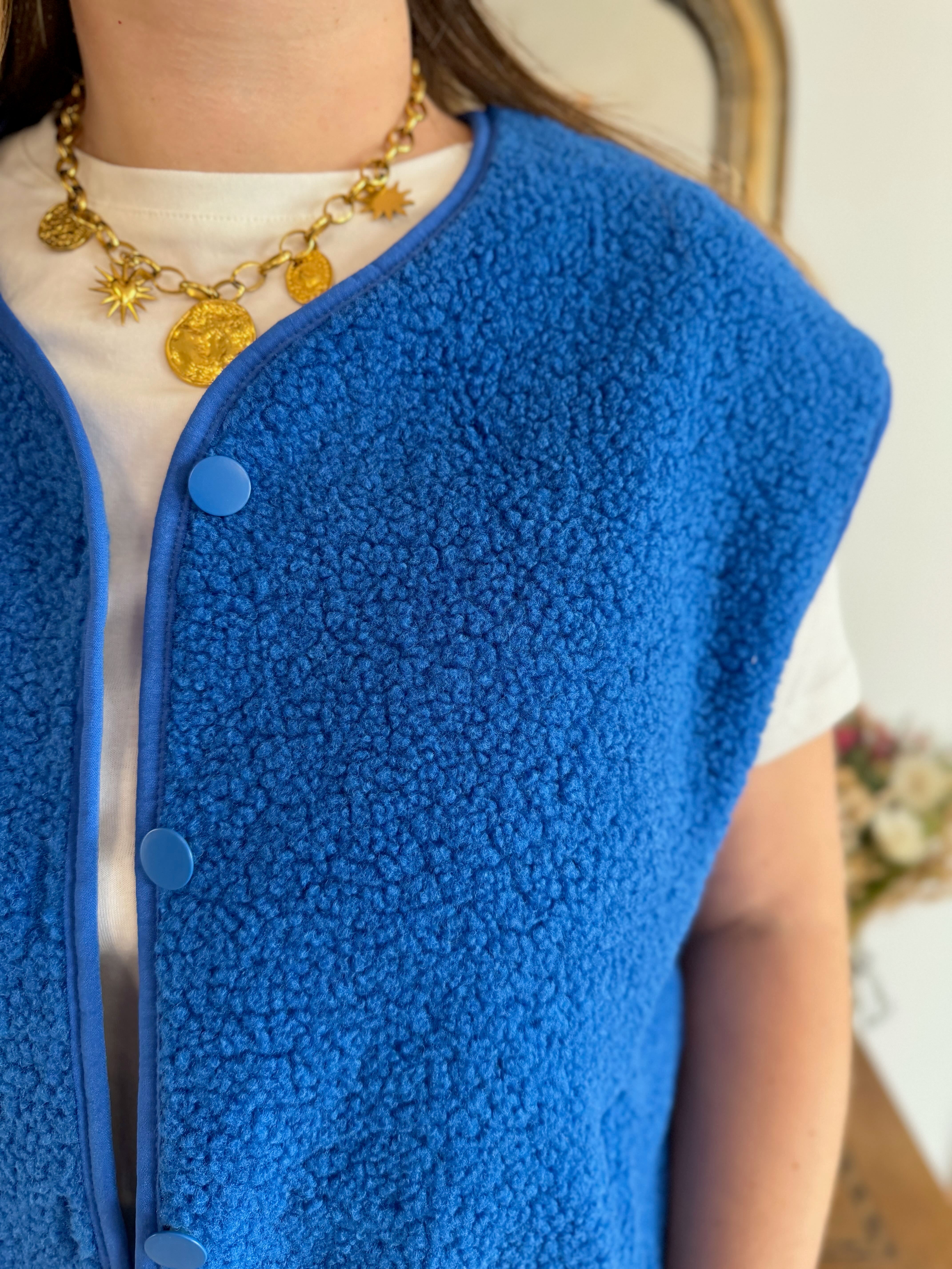 Juliette mesure 1,64m & porte habituellement du 36 pour les hauts. Elle porte la taille S pour les photos de ce gilet sans manche.