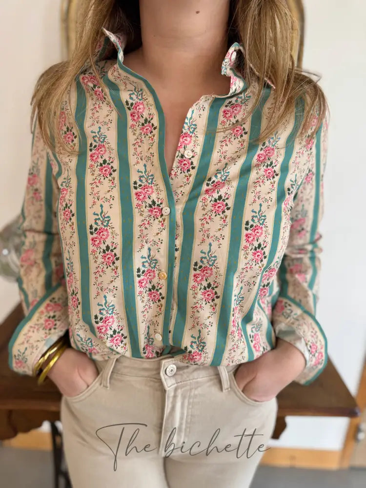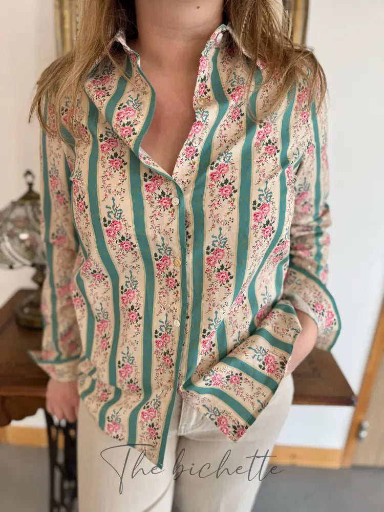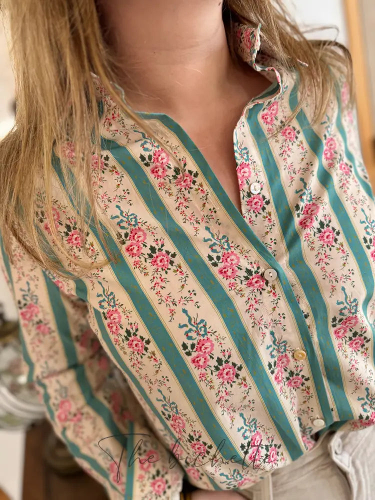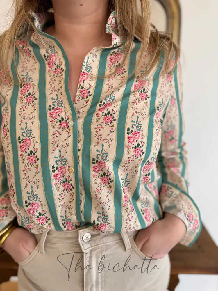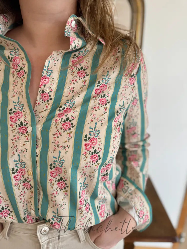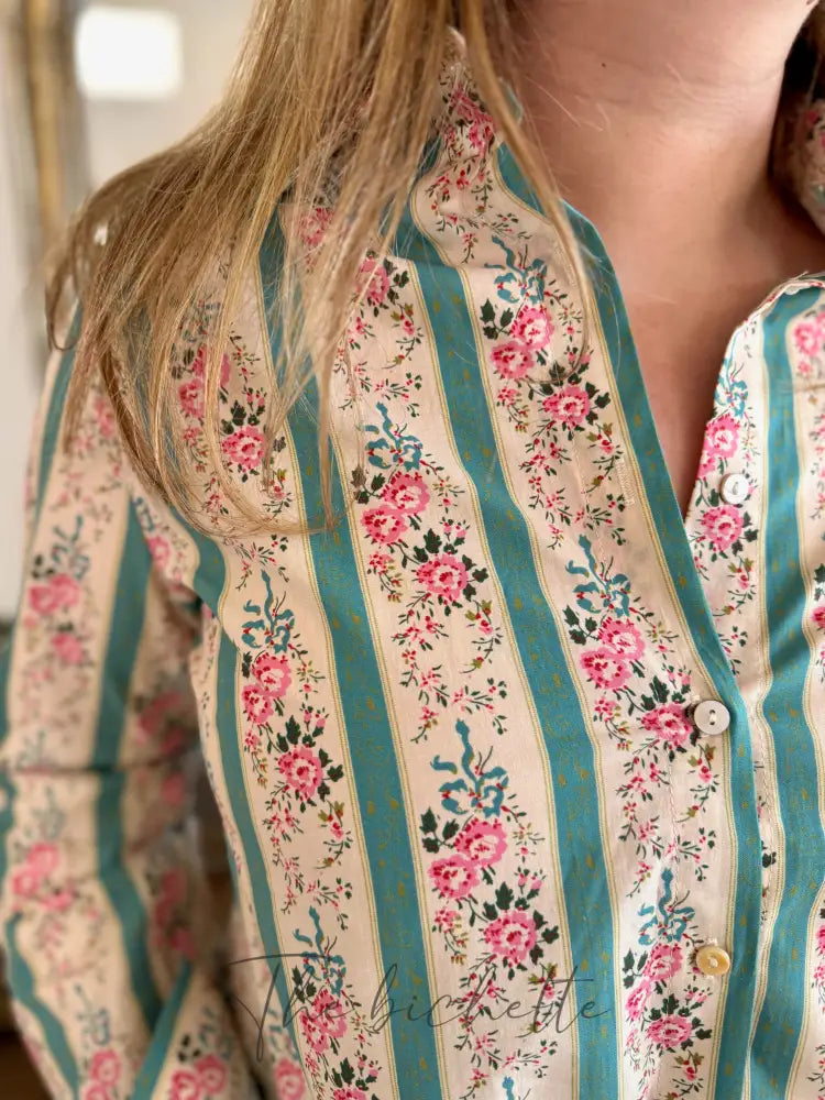 Floral blouse & aqua green stripes • Cherry Blue