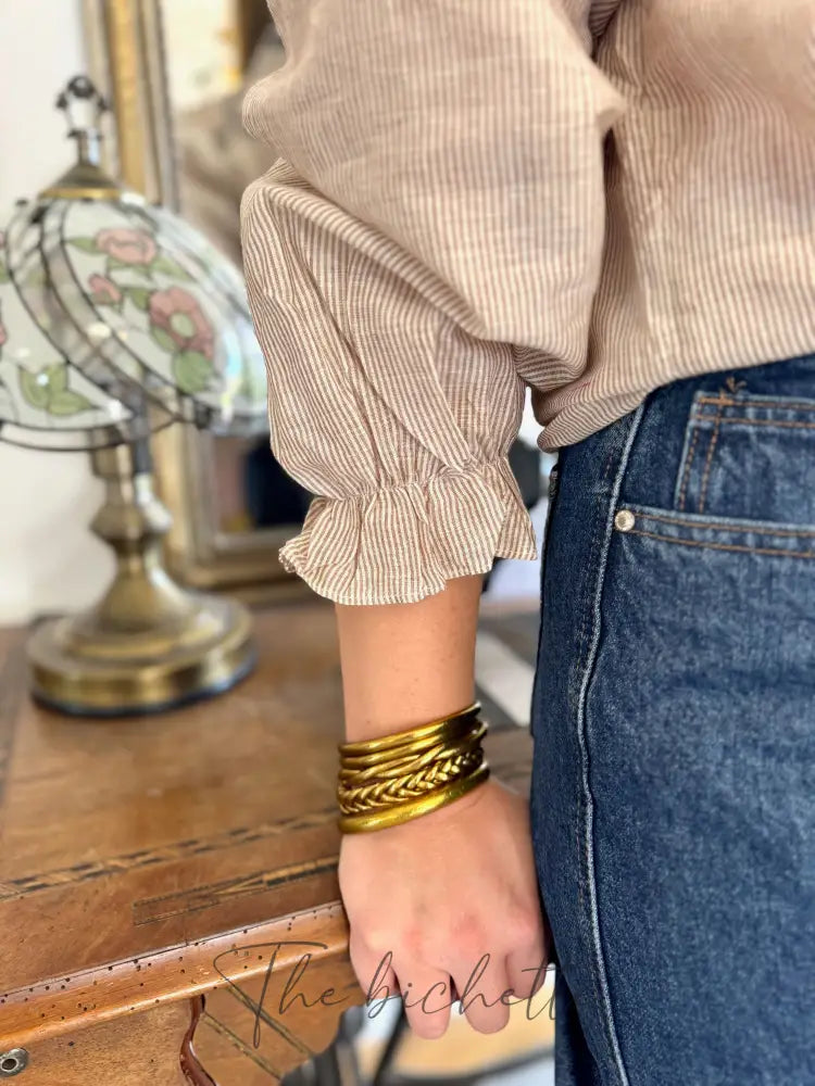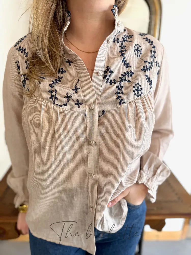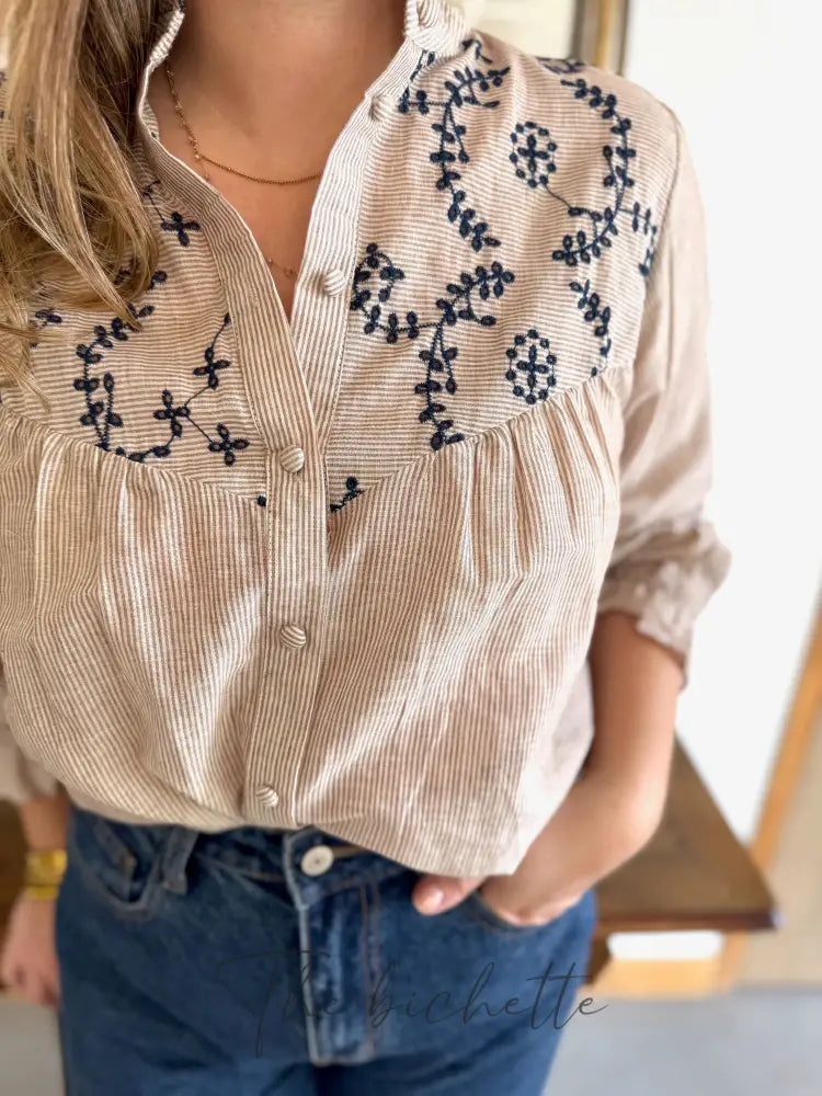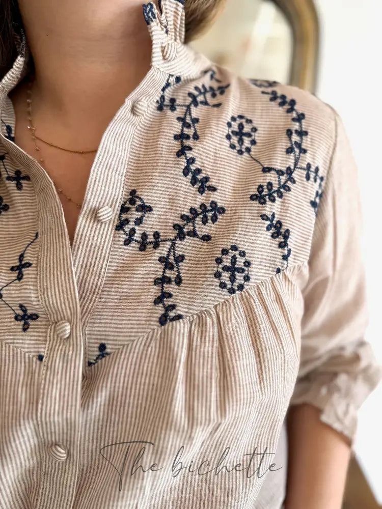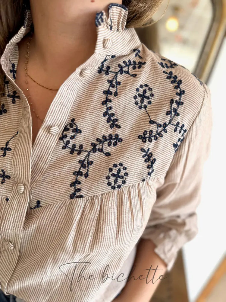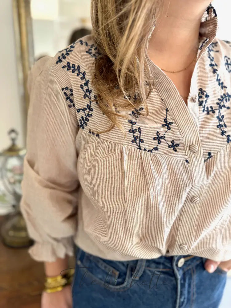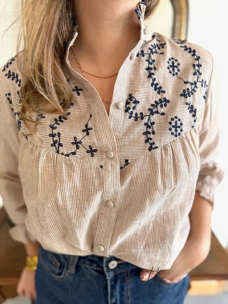 Striped and embroidered blouse, taupe & navy • Maëlle
