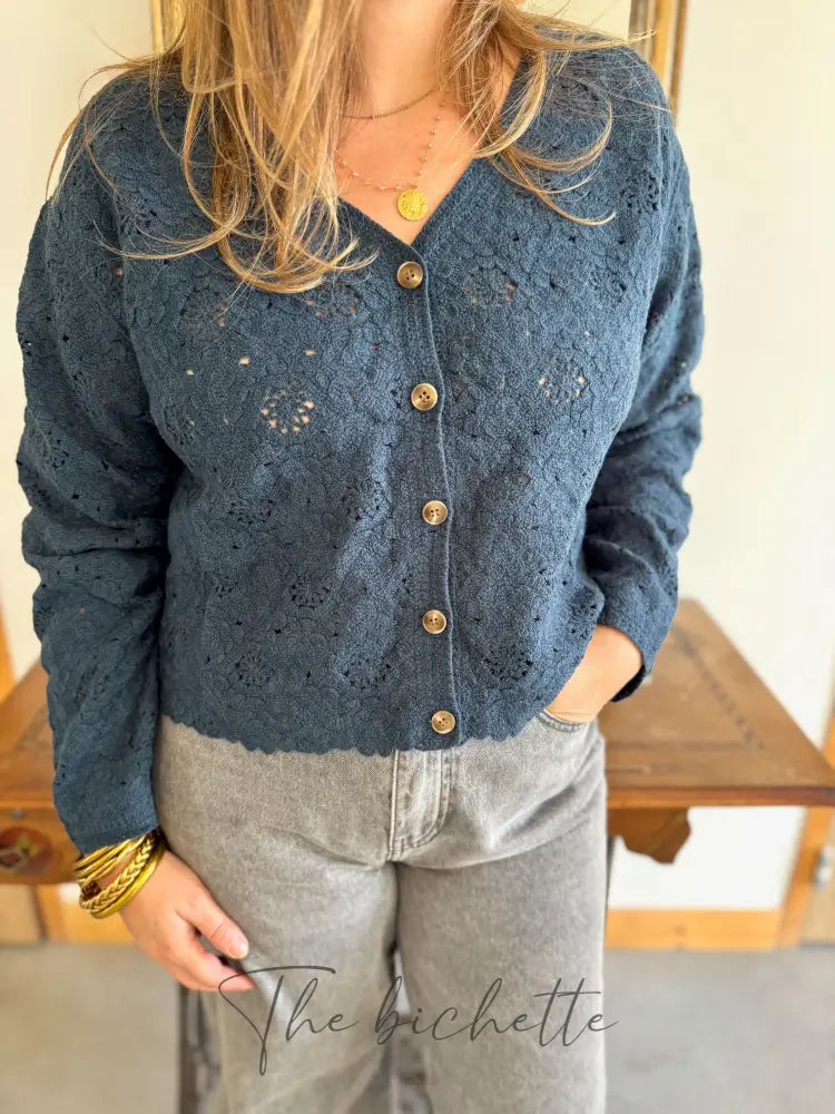 Navy openwork knit cardigan • In April
