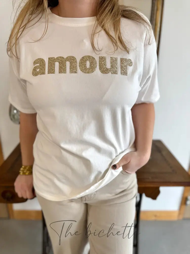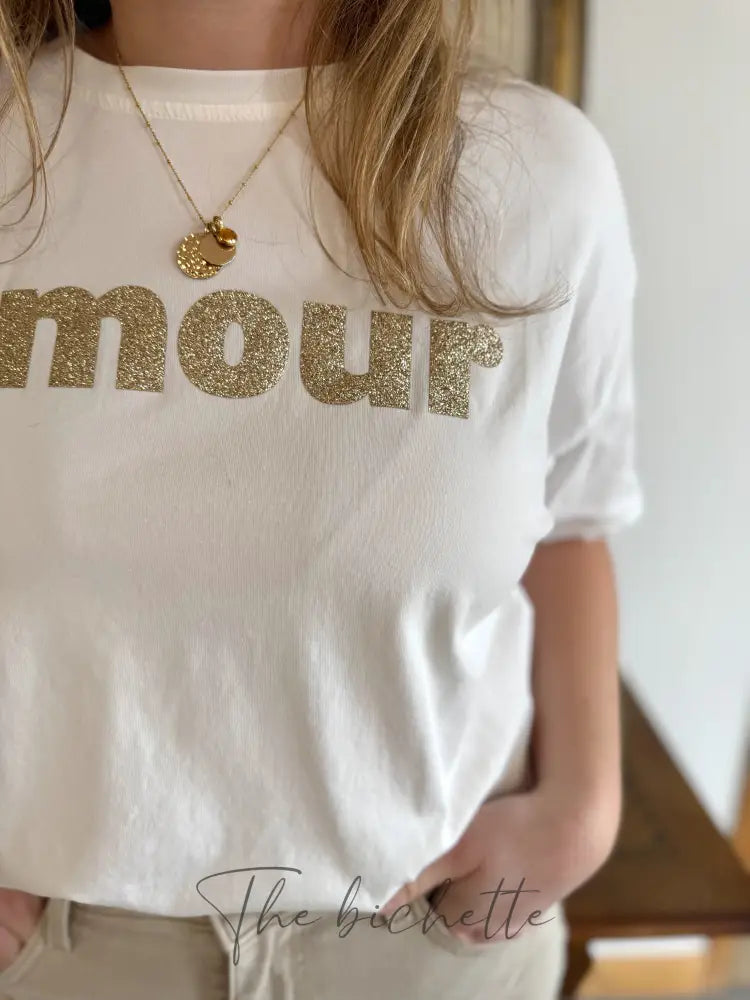 Express your love elegantly with the Garance t-shirt. With its round neck and loose cut ranging from 34 to 42, this golden white t-shirt is the perfect mix of comfort and style.