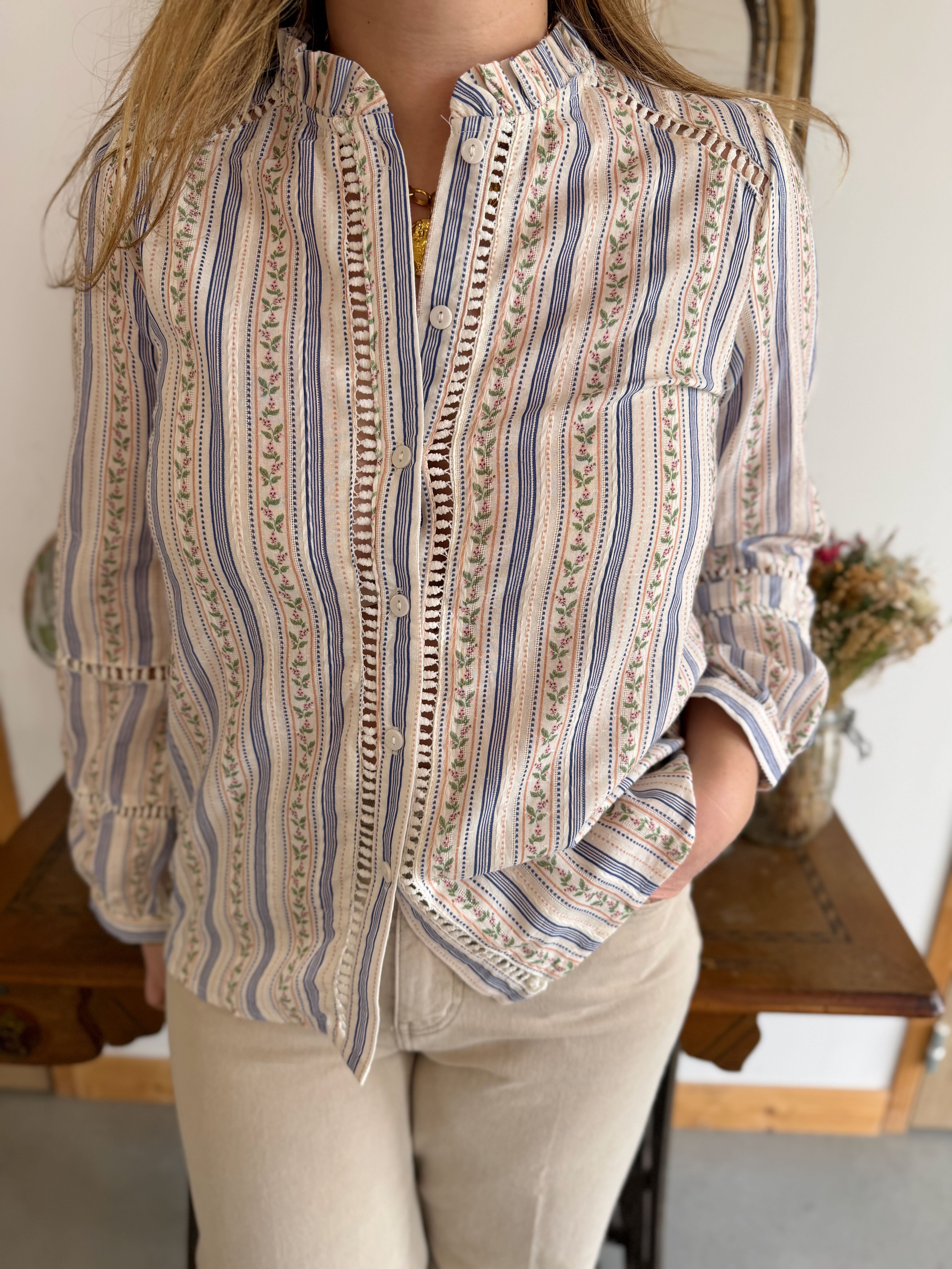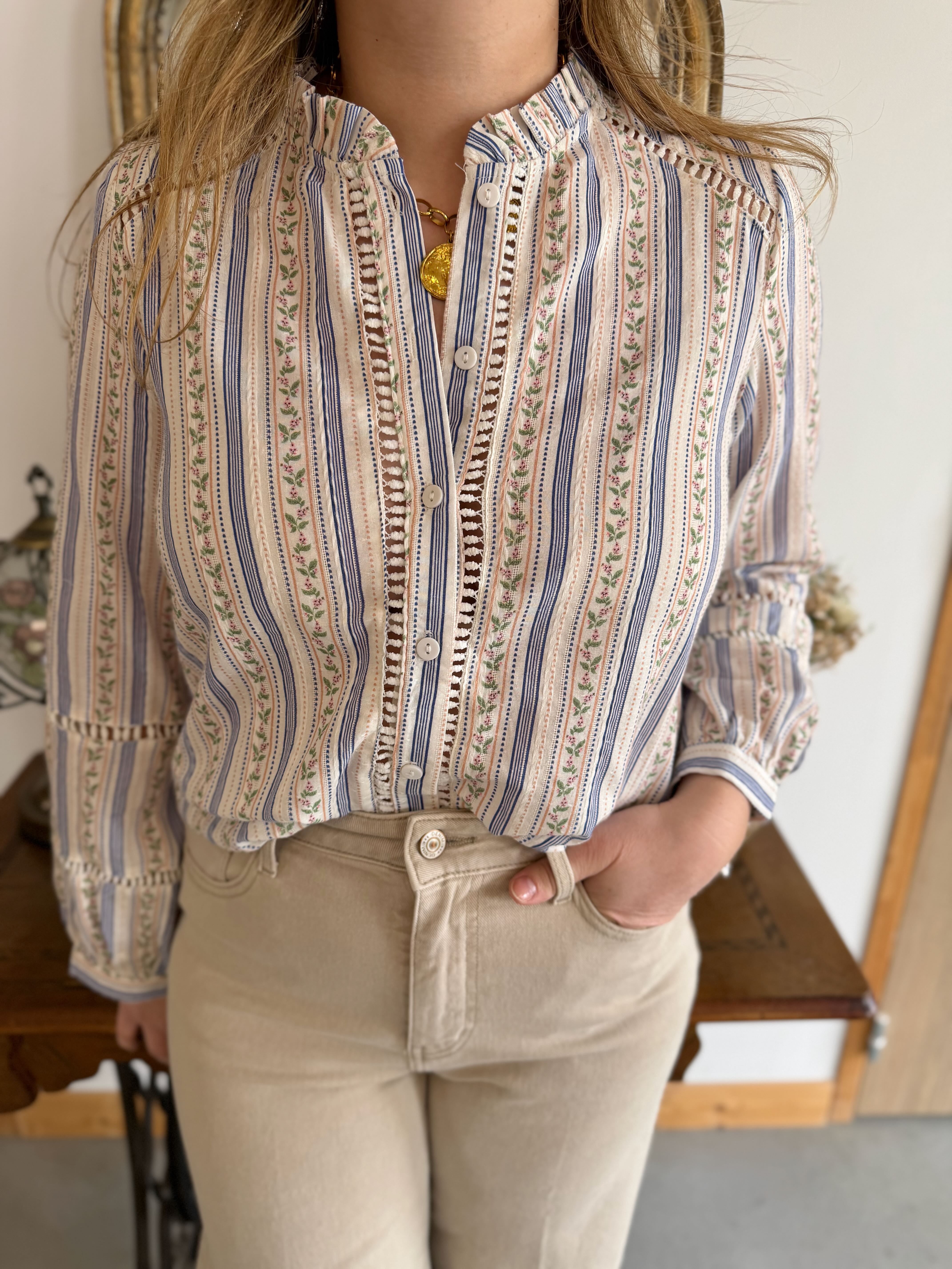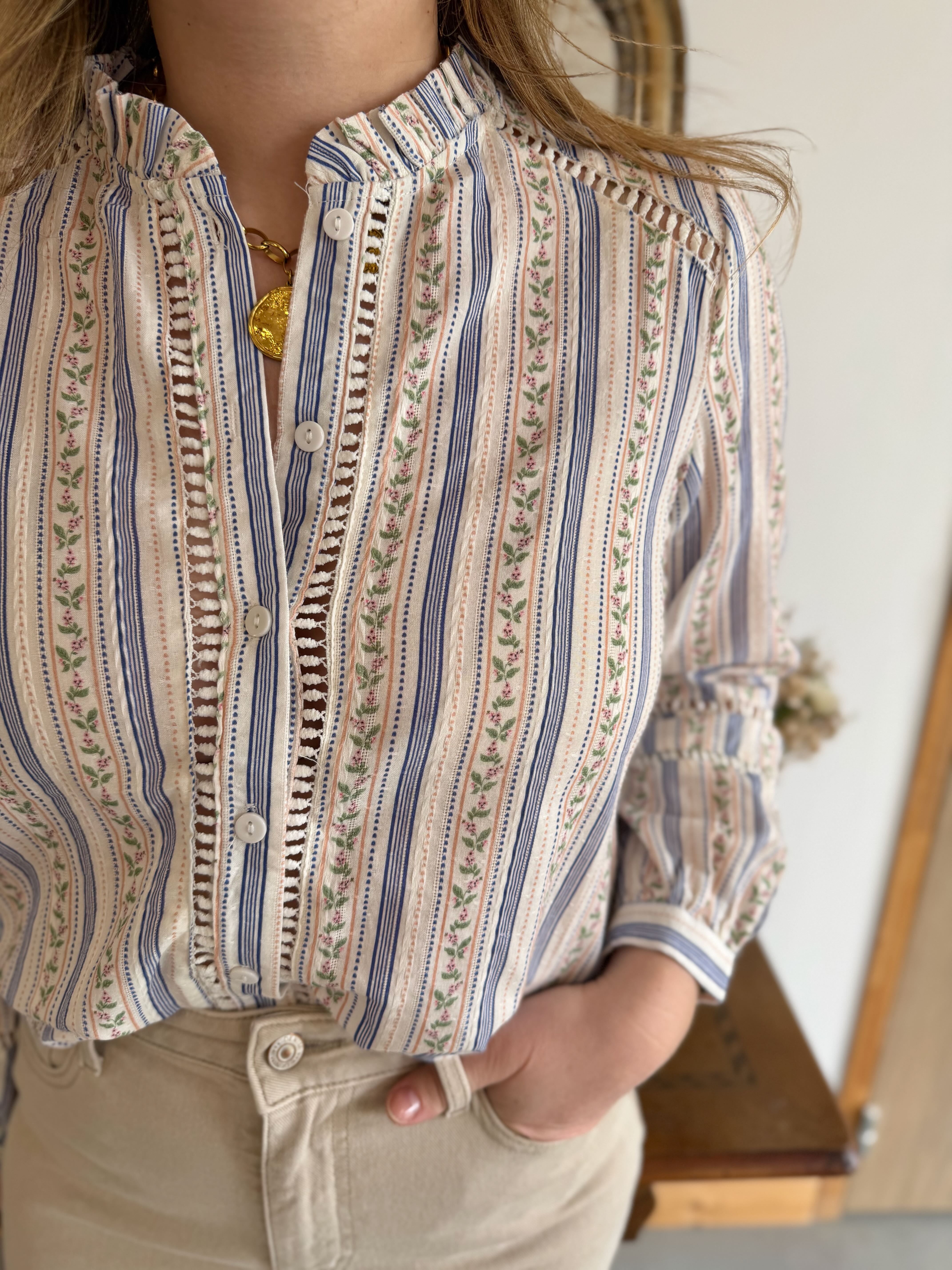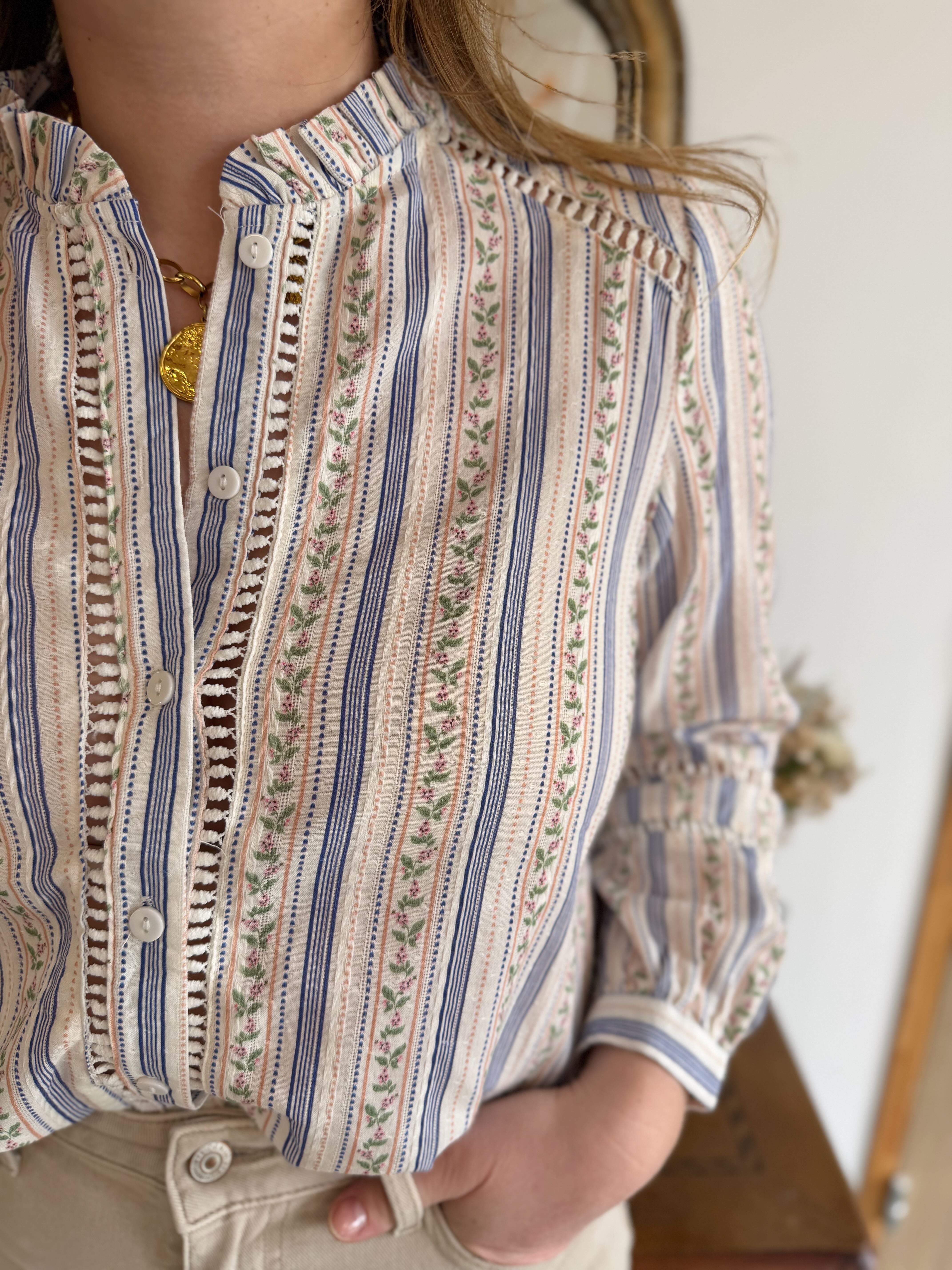 - Détails ajourés le long du chemisier et au niveau des épaules